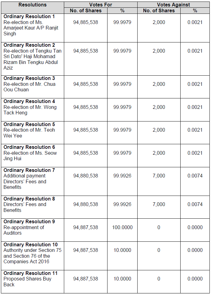 Based on the above results, the Tengku Chairman declared that the following resolutions as CARRIED and RESOLVED:-